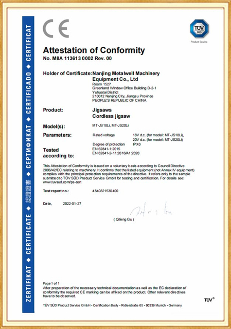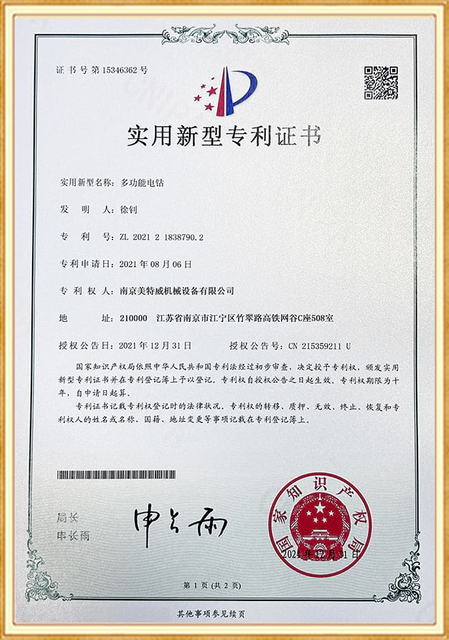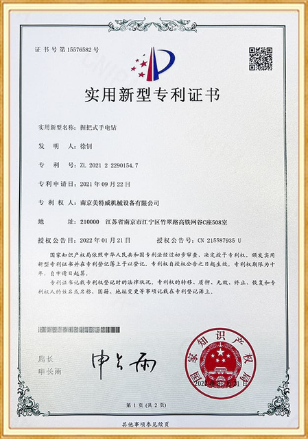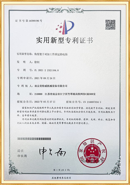 In den letzten Jahren hat unser Unternehmen eine Reihe fortschrittlicher Elektrowerkzeuge und Handwerkzeuge entwickelt, eine Reihe von Gebrauchsmuster-Patentzertifikaten erhalten und das staatliche Amt für geistiges Eigentum hat Patentrechte gemäß dem Patentrecht der Volksrepublik China gewährt Das Gebrauchsmuster-Patentzertifikat wird ausgestellt und im Patentregister eingetragen. Darüber hinaus haben wir für unsere Produkte ein CE- und GS-Zertifikat erhalten.